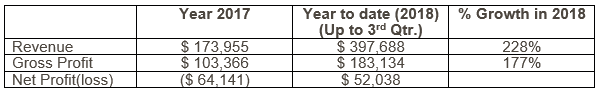 Management is very pleased to announce 3rd quarter revenues of $397,688 as of September 30, 2018. Revenue growth for the first nine months of 2018 increased by 228% as compared to the annual gross revenue of $173,955 for the year 2017. A gross profit of $183,134 was realized in just the first nine months of 2018. An increase of 177% when compared to the $103,366 twelve-month gross profit for the year 2017.